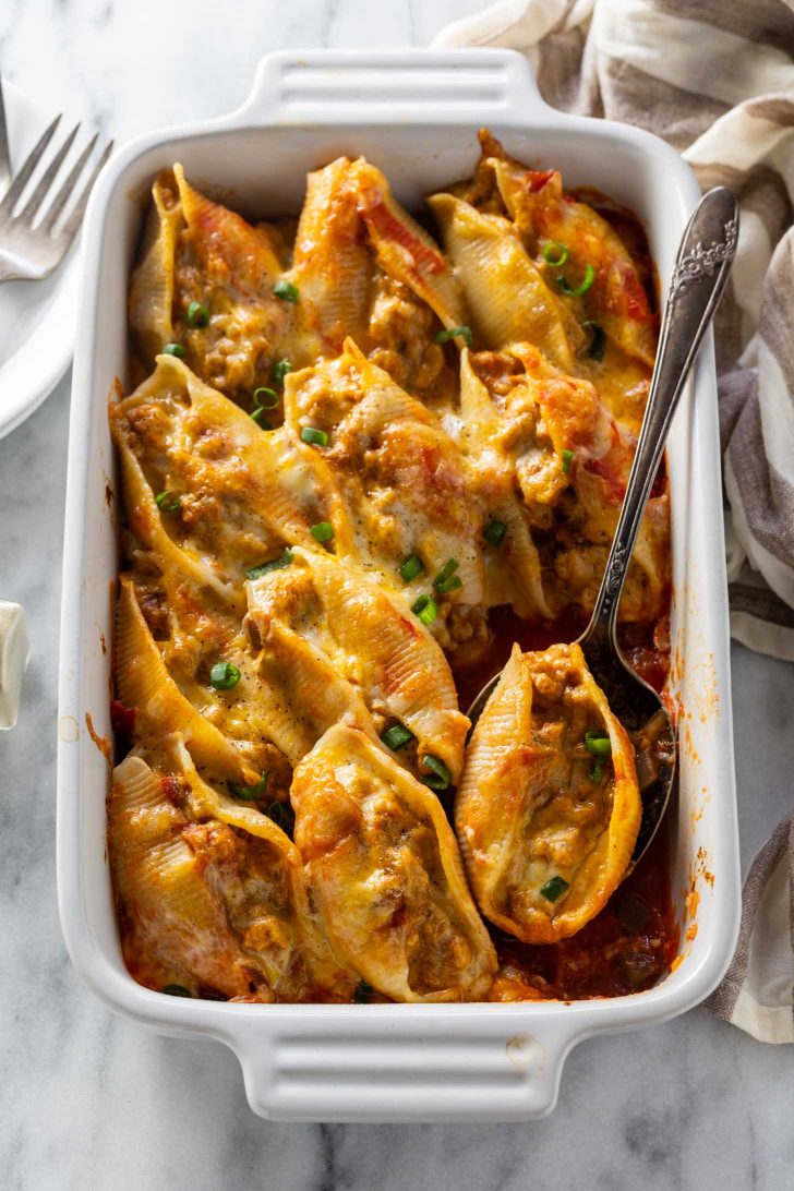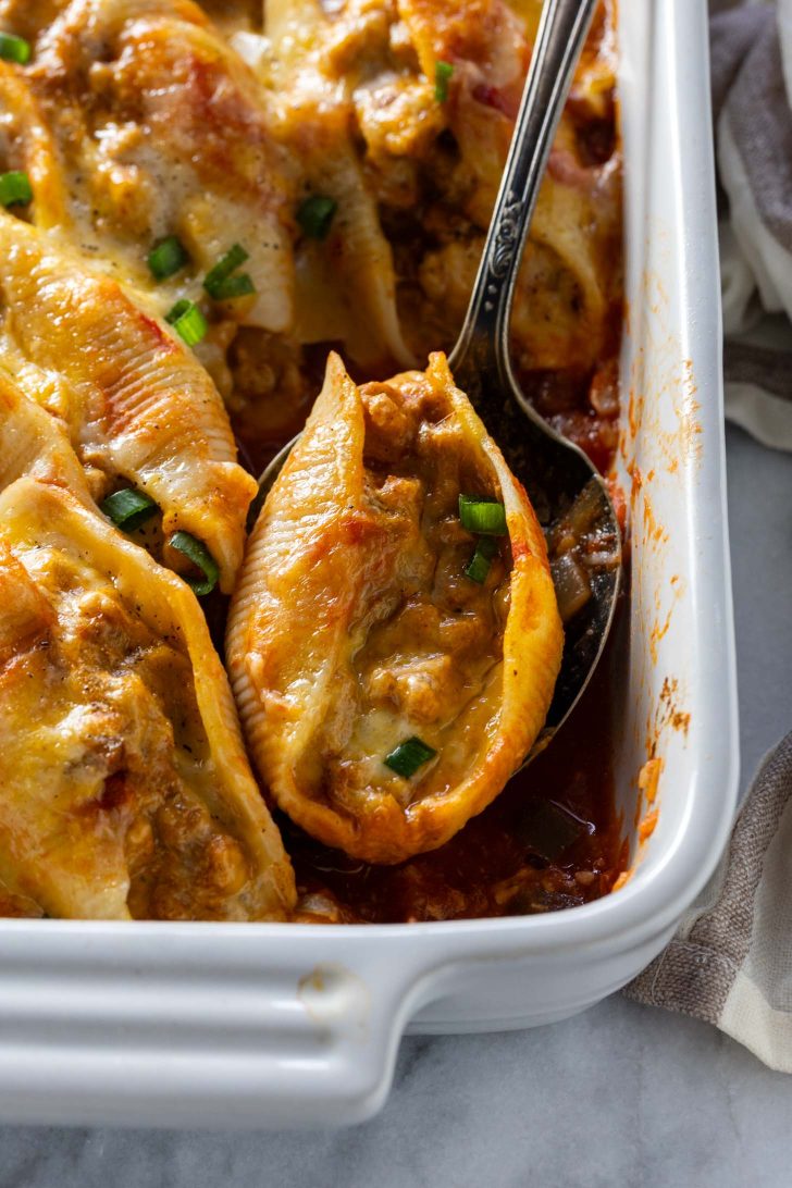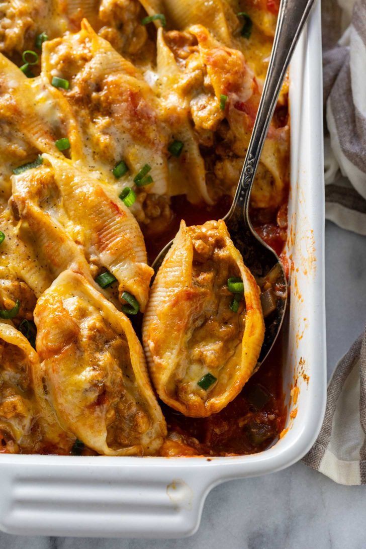 • Using a medium cookie scoop, fill cooked jumbo shells with 1 1/2 – 2 Tablespoons of taco meat. Arrange in prepared baking dish.