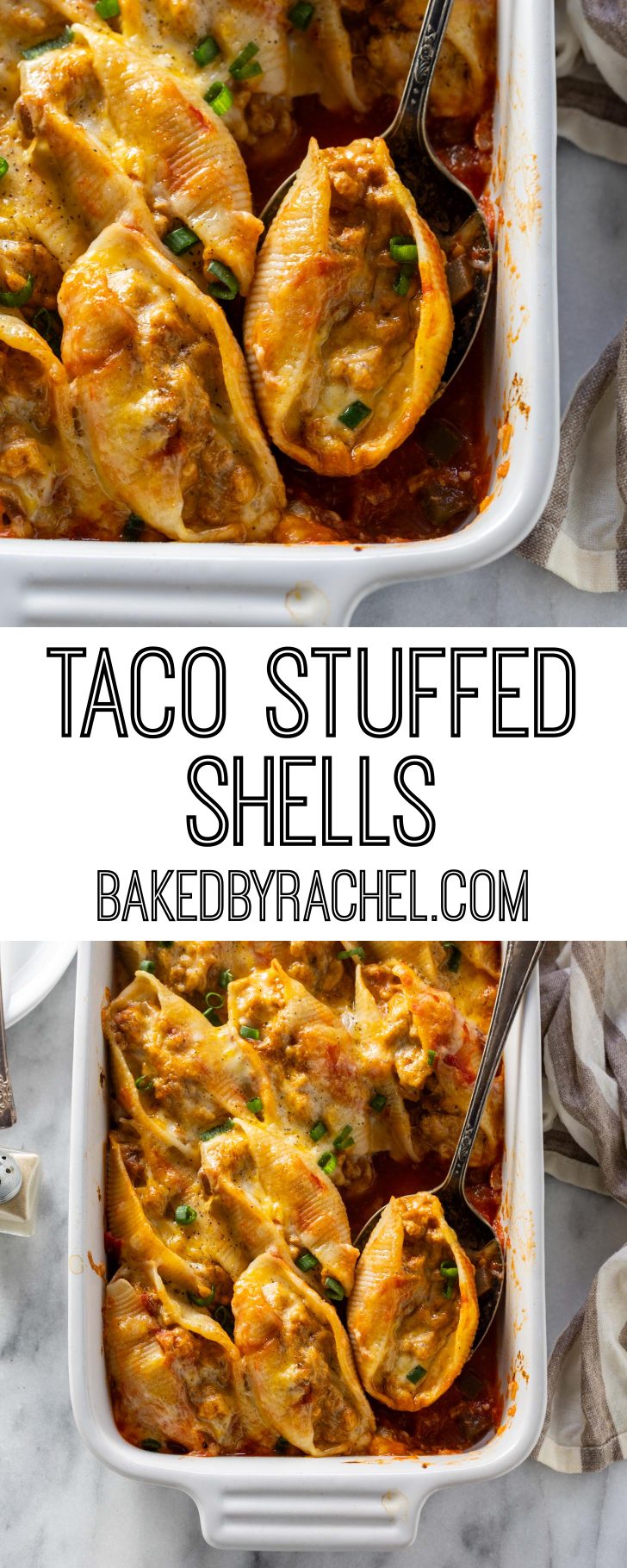 Easy homemade cheesy taco stuffed shells! A super comforting and fun twist for your next taco night!
