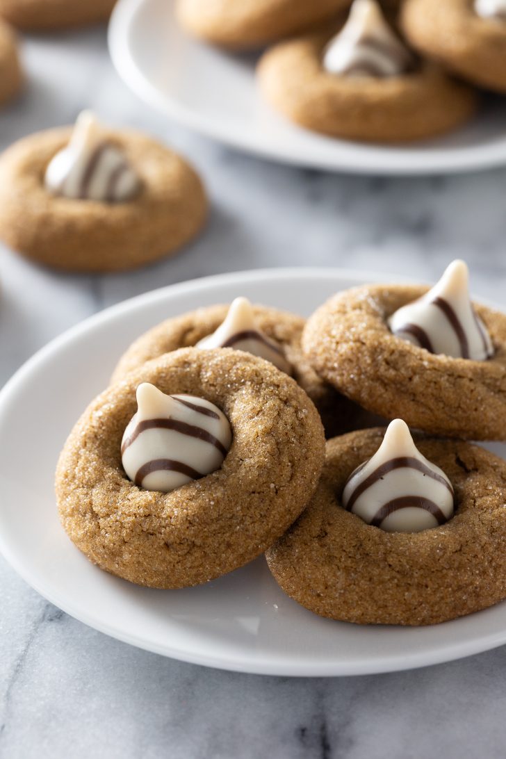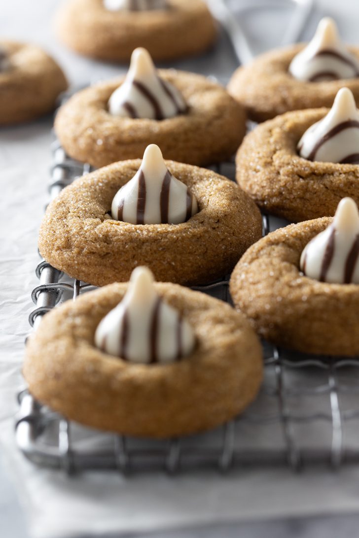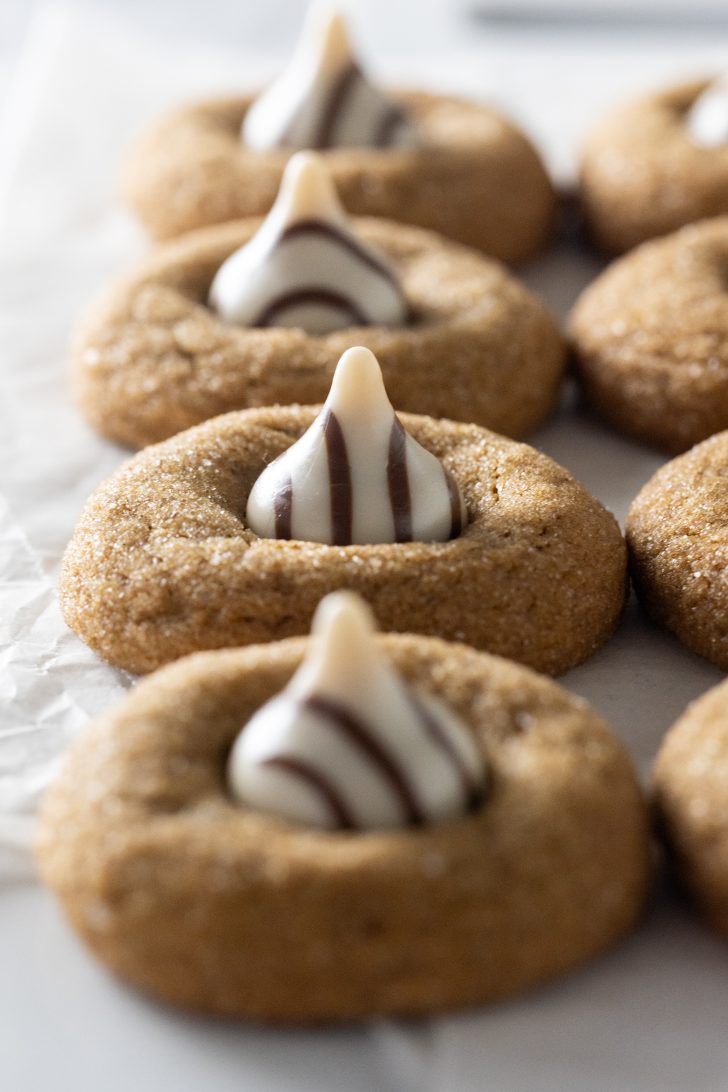 Soft pillowy spiced gingerbread cookies, lightly coated in sugar and topped off with a Hershey hug… or white chocolate and milk chocolate kiss. You can absolutely use solid milk or dark chocolate kisses too! They’ll be equally delicious.
